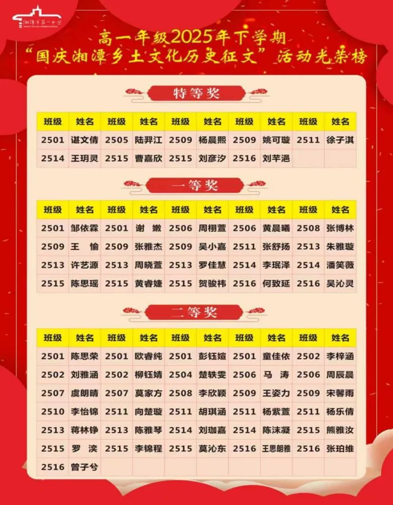 為深入貫徹黨的二十大精神與習近平文化思想,結(jié)合2025年9月3日中國人民抗日戰(zhàn)爭暨世界反法西斯戰(zhàn)爭勝利80周年紀念大會及閱兵活動的精神內(nèi)涵,學校面向高一年級組織開展了“國慶湘潭鄉(xiāng)土文化”征文活動。本次活動以“傳承抗戰(zhàn)精神、彰顯湘潭特色”為主線,深度融合本土文化資源與國家歷史記憶,引導學生在與家鄉(xiāng)歷史的對話中,切身感受鄉(xiāng)土文化的獨特魅力與抗戰(zhàn)精神的磅礴力量。
